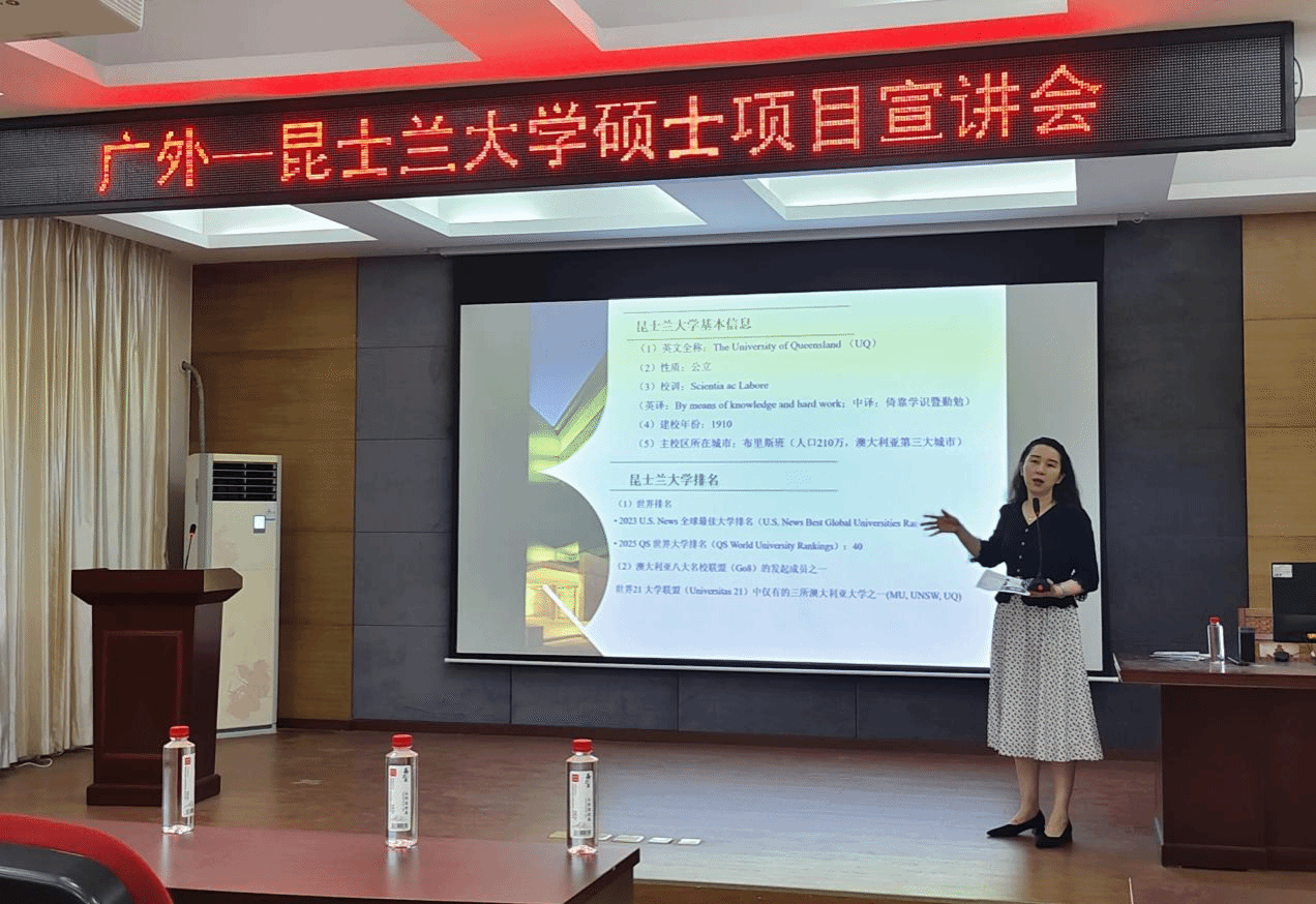 5月6日下午,广东外语外贸大学石静教授莅临我校,在金利来201室召开广东外语外贸大学—澳大利亚昆士兰大学硕士项目宣讲会。国际交流合作处处长高旭、相关老师及相关学院学生代表40余人参加了此次宣讲会。会议由高旭处长主持。